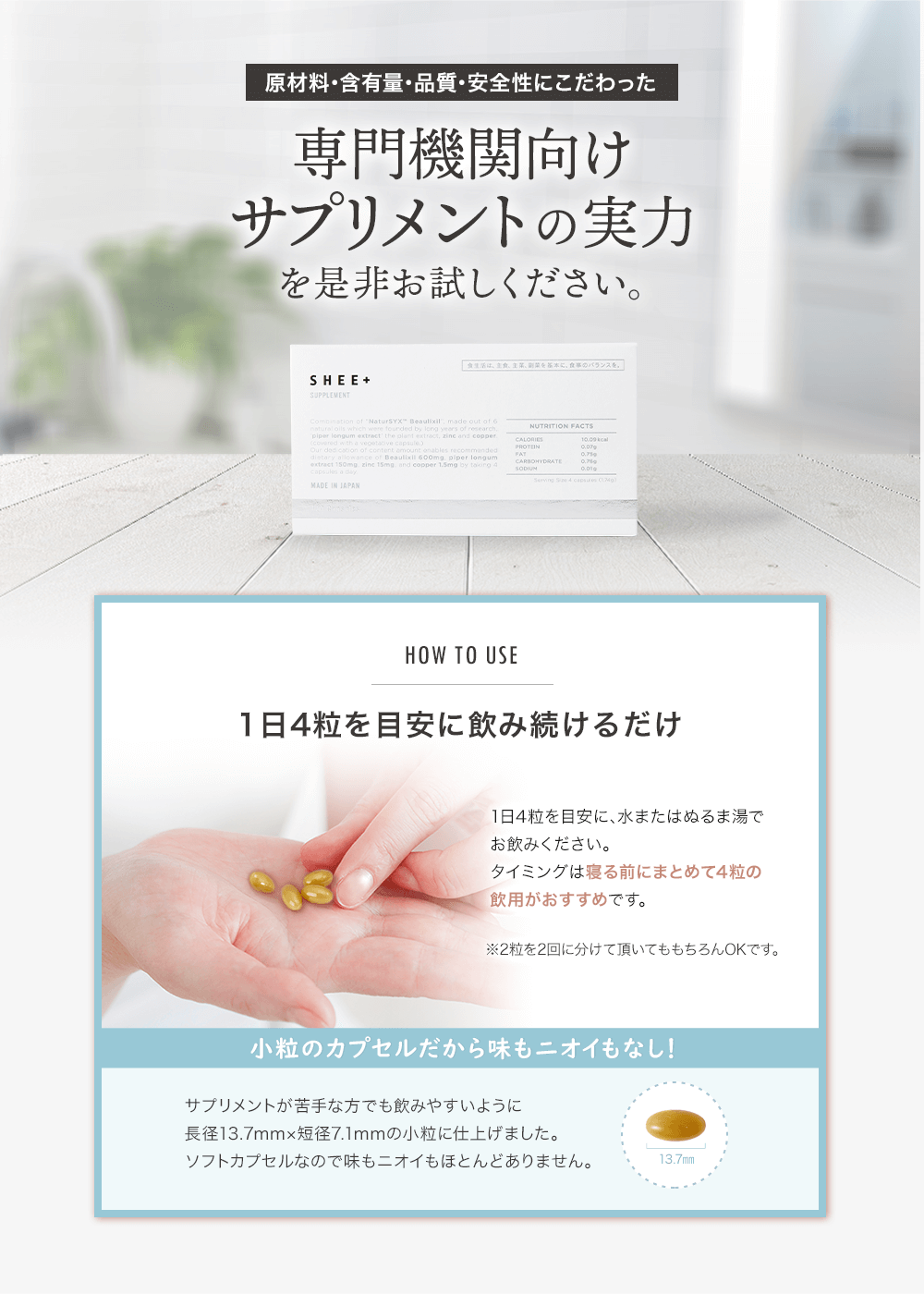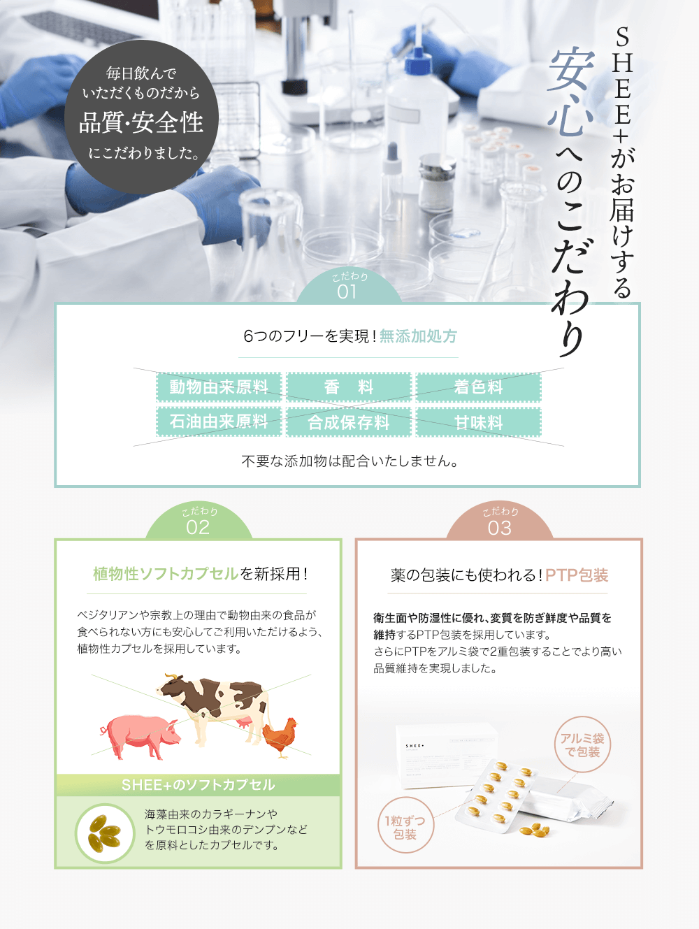 SHEE+サプリメントではベジタリアンの方や宗教上の理由で動物(牛・豚・魚など)由来の食品が食べられない方にも安心してご利用いただけるよう、植物性のソフトカプセルを採用しております。