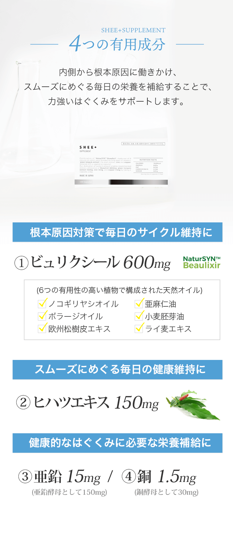 希少で高価な有用素材「ビュリクシール」「ヒハツエキス」を配合したSHEEサプリメントに「亜鉛15㎎」「銅1.5㎎」が新たに追加されパワーアップ!実感を第一に考えた先進素材を厳選配合しています。